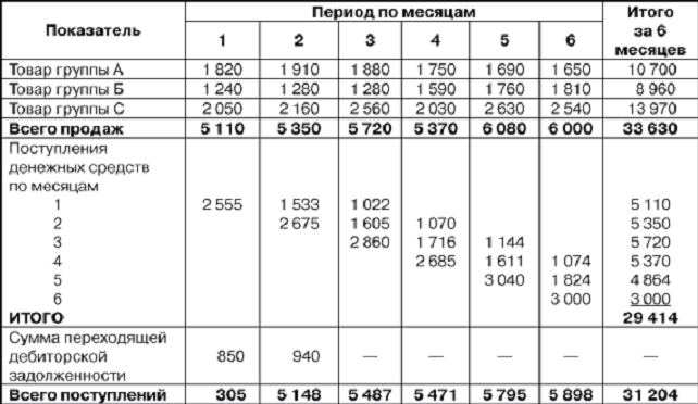 В нашем примере определим, что погашается задолженность в размере 850 тыс. руб. в 1-ом месяце и в размере 940 тыс. руб. - во 2-ом. Таким образом, итог плановых поступлений денежных средств от продаж в плановом периоде составляет: