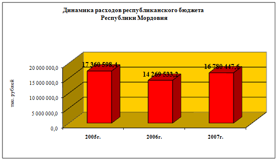 Расходная часть республиканского бюджета Республики Мордовия (в соответствии с функциональной классификацией расходов) за 2005 год исполнена в сумме 17360598,4 тыс. руб., что составило 97,2% от утвержденного плана; в 2006 году при плановом значении 14765603,6 тыс. руб. фактически израсходовано 14269533,2 тыс. рублей; а в 2007г. расходная часть бюджета исполнена в сумме 16780447,6 тыс. руб. В среднем исполнение республиканского бюджета составляет 94,23% от плана, что является положительным моментом, характеризующим процесс расходования бюджетных средств в полном объеме. Наглядно изменение расходов республиканского бюджета представлено на рисунке 2.1.